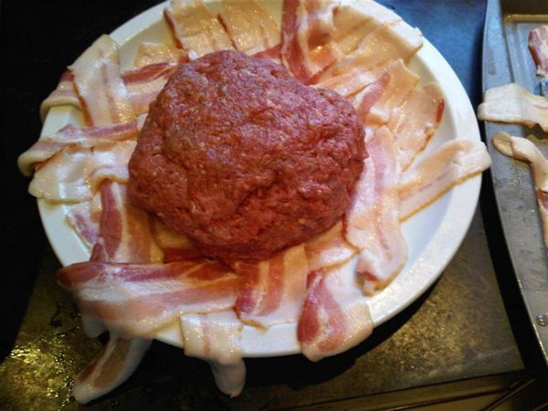 As most FSWC fans know, “man cooking” typically starts with a classic bacon weave. Take several strips of bacon and weave them into a, um…weave pattern. Top the bacon weave with approximately two pounds of ground beef.