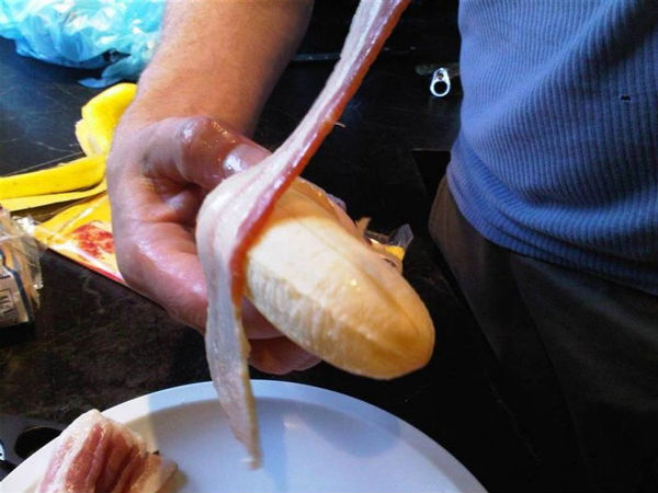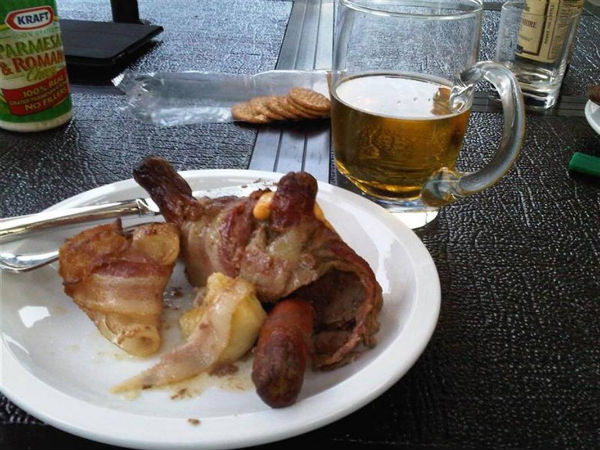 Seven men. Four Meat Turtles. Three Bacon-Wrapped Bananas. Add beer and scotch to taste. The only thing left was half of a Meat Turtle which was eaten the next day.